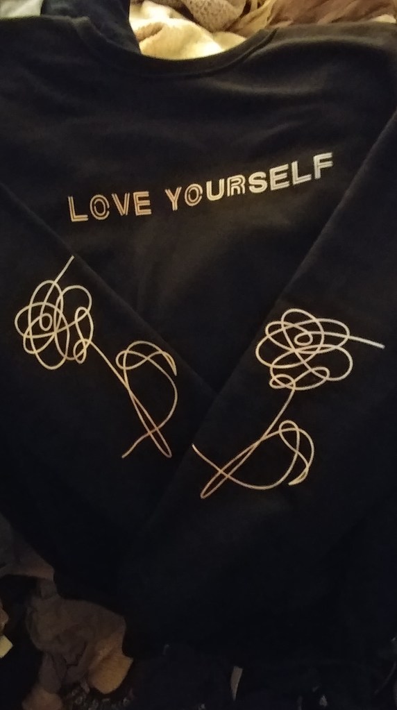 It was a pretty nice evening but a little chilly, so I decided to wear my Love Yourself sweatshirt with an outer vest. Basically with the vest on you couldn’t see the BTS logo on the back, nor the words ‘Love Yourself’ on the front. On the sleeves are just the multi pink hue of the LY squiggles logo. While on the train to the theater I see this girl looking at my sleeves. I just think to myself, maybe she just likes the design. Then as she is about to get off the train she looks at me, smiles, and says ARMY? I smile back and nod my head. How in the hell did she know? I get into the theater and take off my outer vest, not even a minute later this young girl looks at me and says Borahae (I purple you) and throws me a finger heart! And that’s when it hit me… “I’M IN A GANG”! The gang is called ARMY, our colors are purple, our call sign is Borahae and our gang signs are finger hearts!